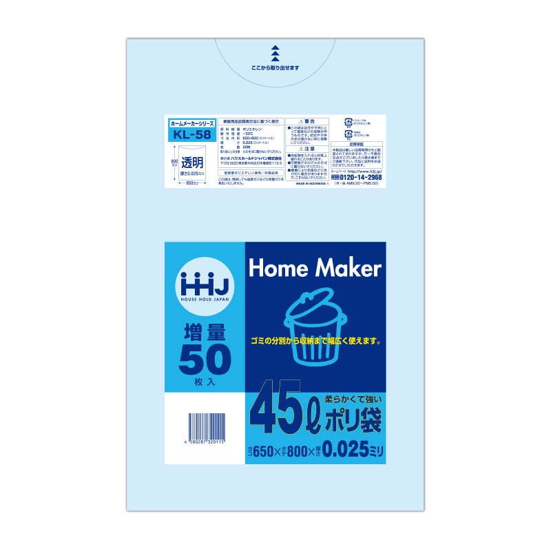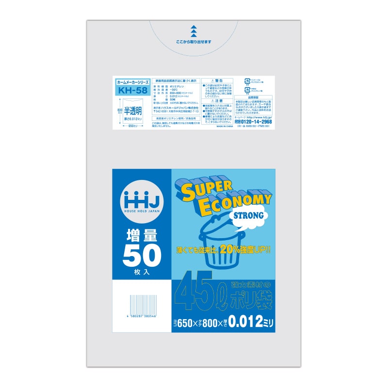 ハウスホールドジャパン ポリ袋 45L KH58 半透明 50枚入 1冊(ご注文単位30冊)【直送品】