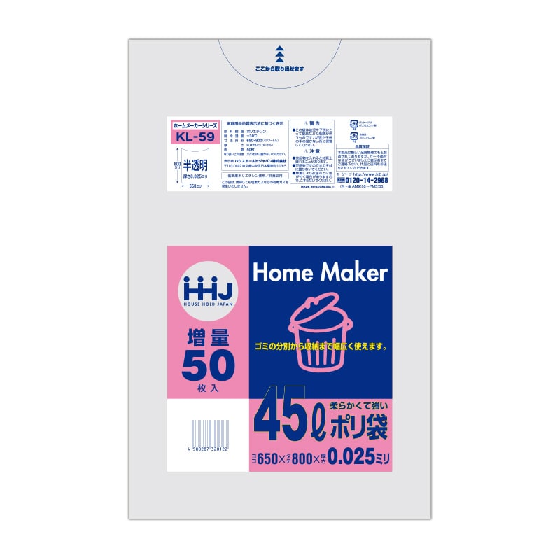 ハウスホールドジャパン ポリ袋 45L KL59 半透明 50枚入 1束(ご注文単位15束)【直送品】