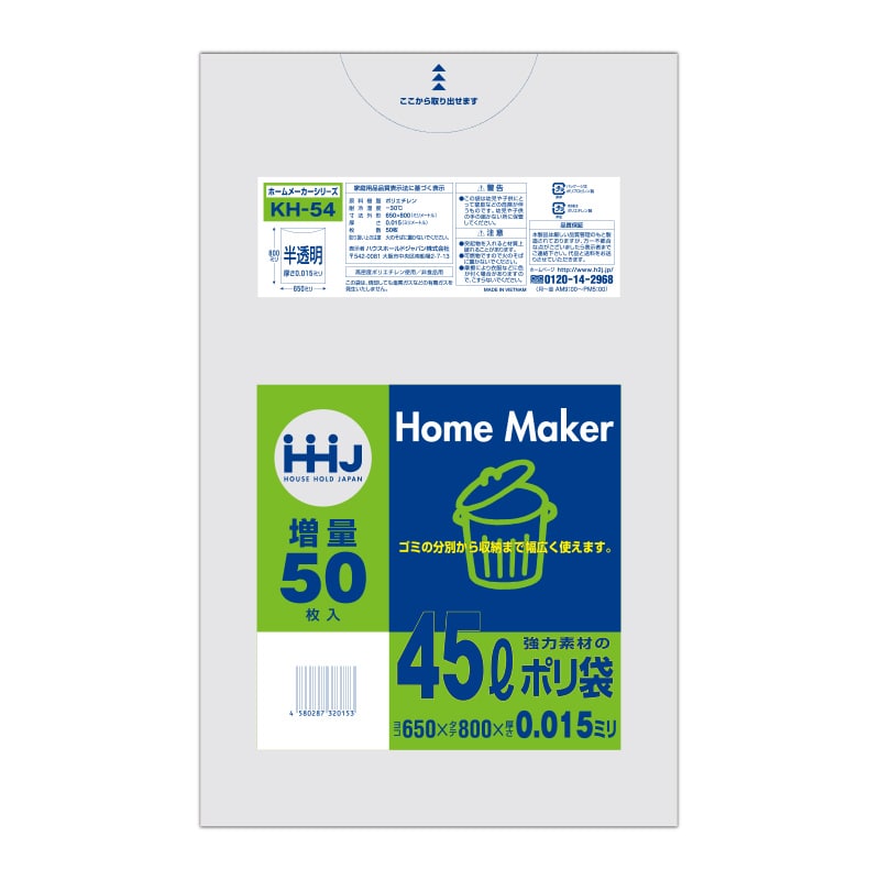 ハウスホールドジャパン ポリ袋 45L KH54 半透明 50枚入 1冊(ご注文単位25冊)【直送品】