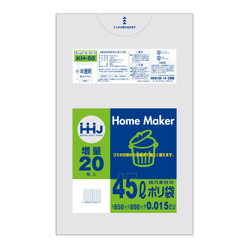 ハウスホールドジャパン ポリ袋 45L KH50 半透明 20枚入 1冊(ご注文単位60冊)【直送品】
