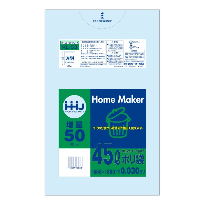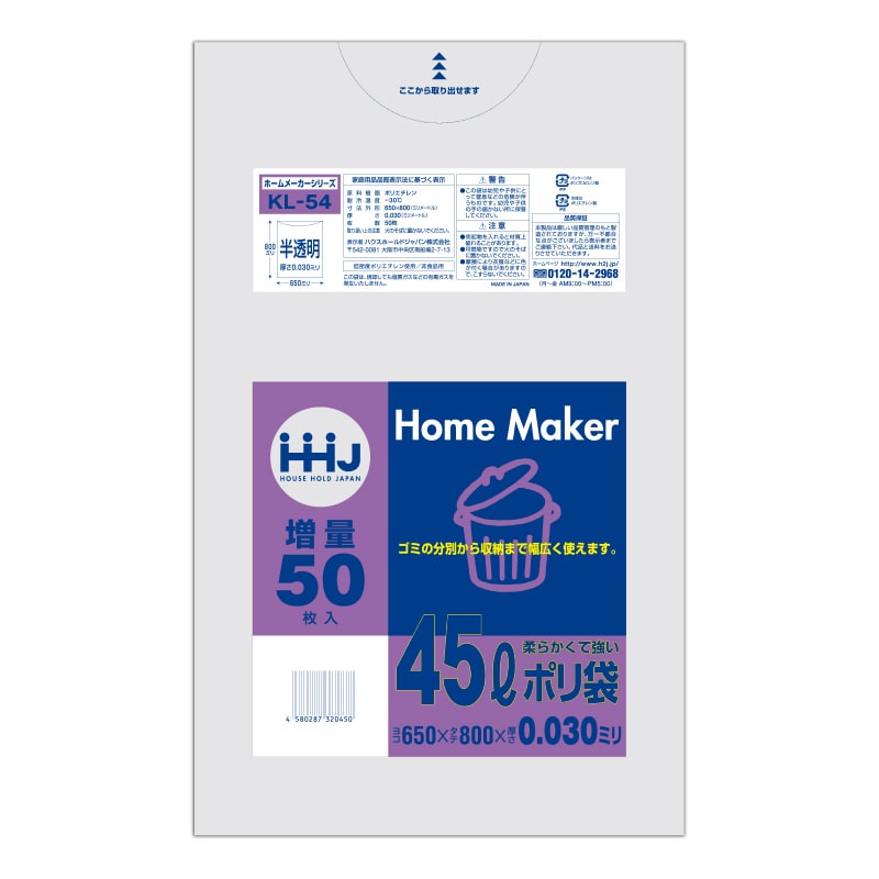 ハウスホールドジャパン ポリ袋 45L KL54 半透明 50枚入 1冊(ご注文単位15冊)【直送品】