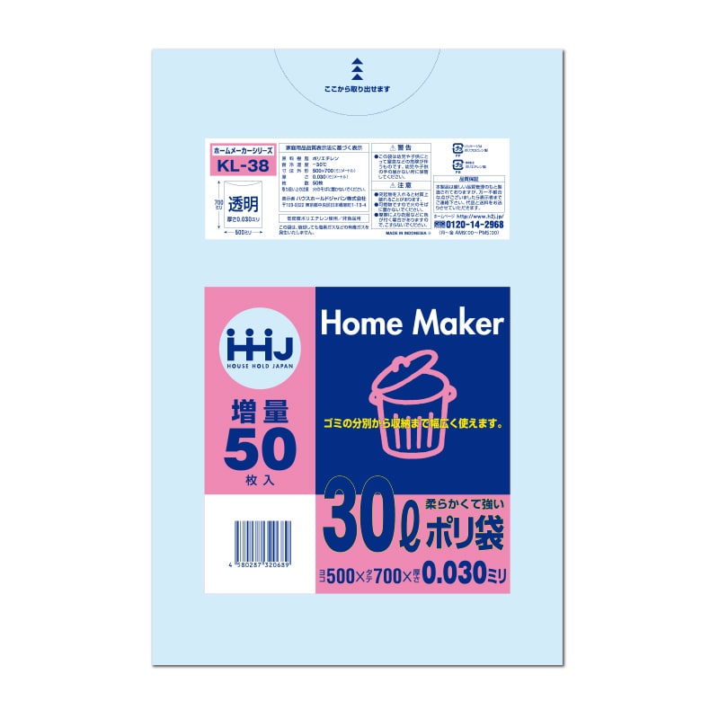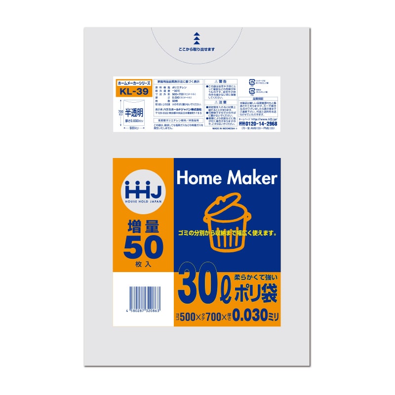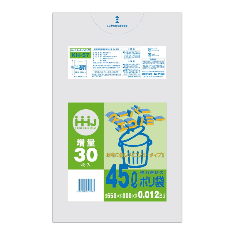 ハウスホールドジャパン ポリ袋 45L KH57 半透明 30枚入 1冊(ご注文単位50冊)【直送品】