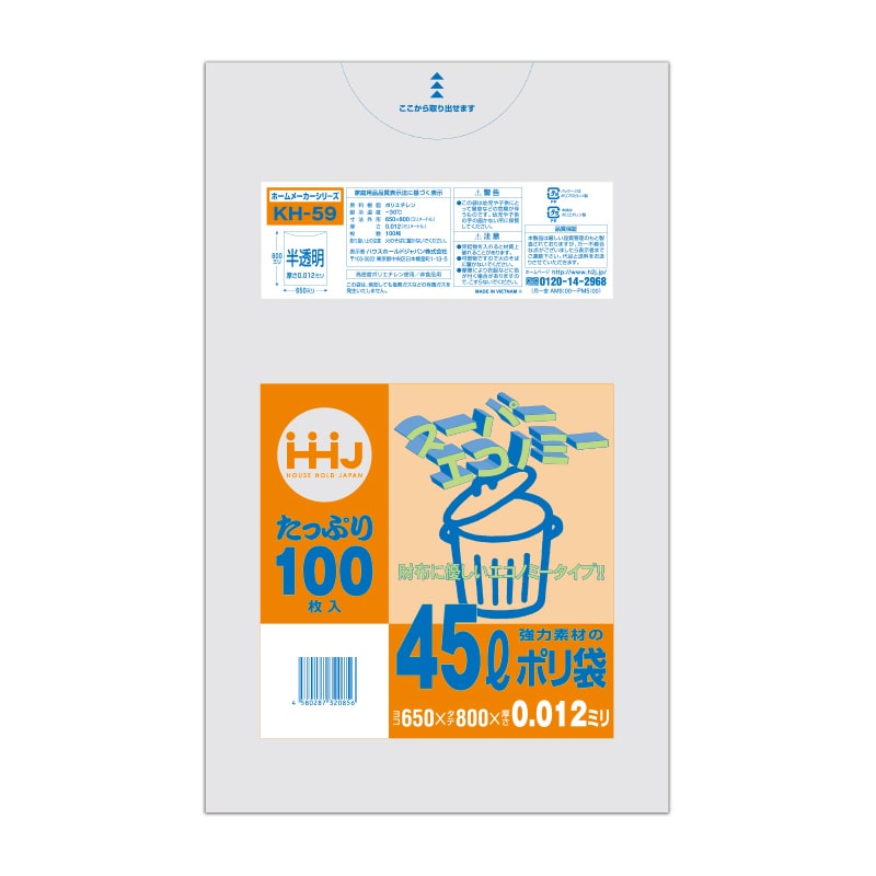 ハウスホールドジャパン ポリ袋 45L KH59 半透明 100枚入 1束(ご注文単位15束)【直送品】