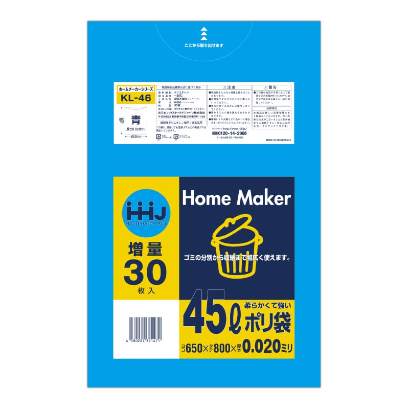 ハウスホールドジャパン ポリ袋 45L KL46 青 30枚入 1冊(ご注文単位30冊)【直送品】