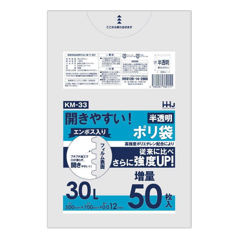 ハウスホールドジャパン ポリ袋 45L KM53 半透明 30枚入 1束(ご注文単位30束)【直送品】