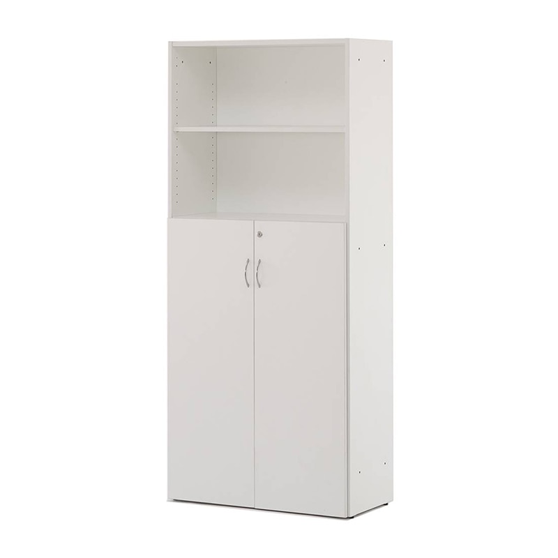 グレーの背板がスタイリッシュなプリーマシリーズのハイシェルフホワイト共通扉付き。上段はオープンで使い分けができます。上から2段目の棚板のみ固定、そのほか可動棚が3枚付属、32mmピッチでお好みの位置に設置可能です。背面化粧仕上げで裏側もすっきり。扉取手はシンプルなアルミ製、鍵が2個付属しています。別売のオプション棚板を追加してご利用いただけます。耐荷重棚板1枚あたり:約20kg(均等荷重)、総耐荷重:約100kg●お客様組立て商品です(2人以上で約40分)●重量:55.2kg●扉:低圧メラミン樹脂化粧木質ボード・PVCエッジ・スチール(粉体塗装)/取手:アルミ