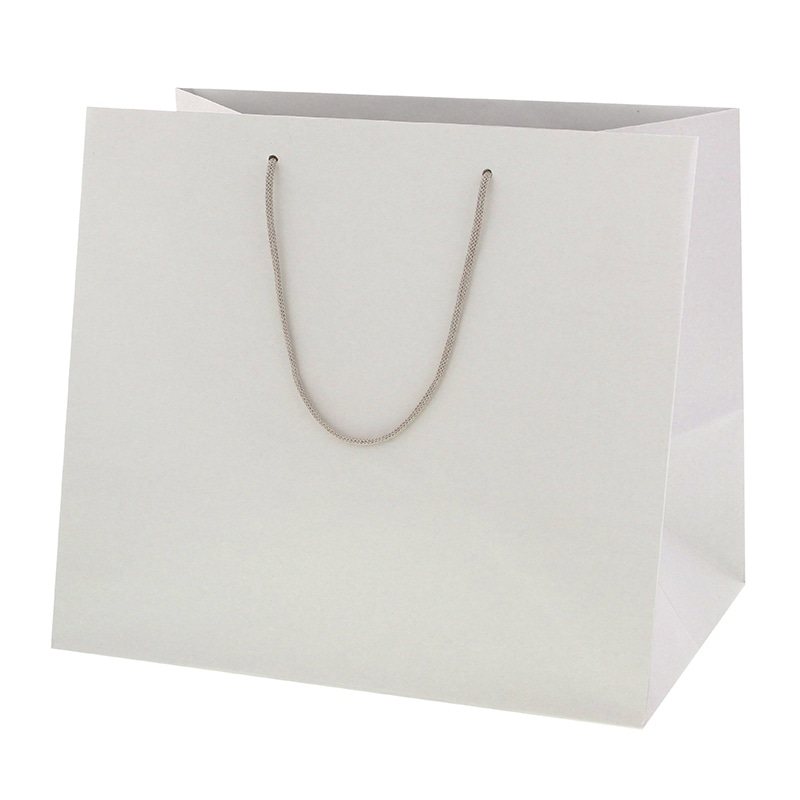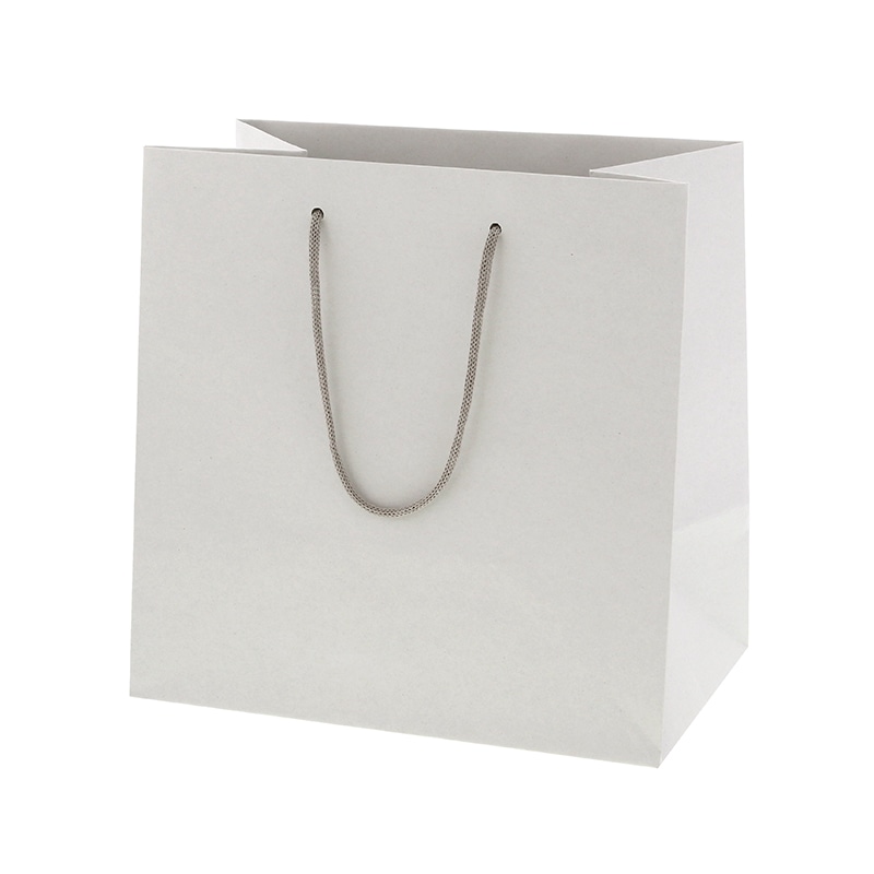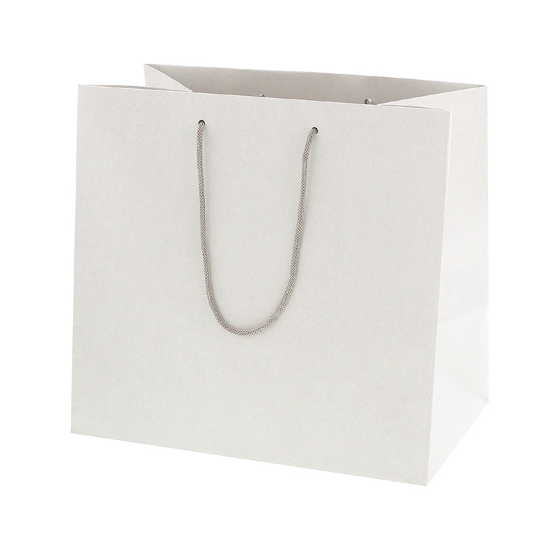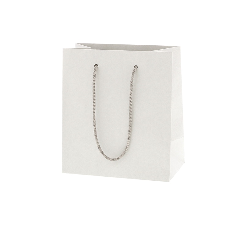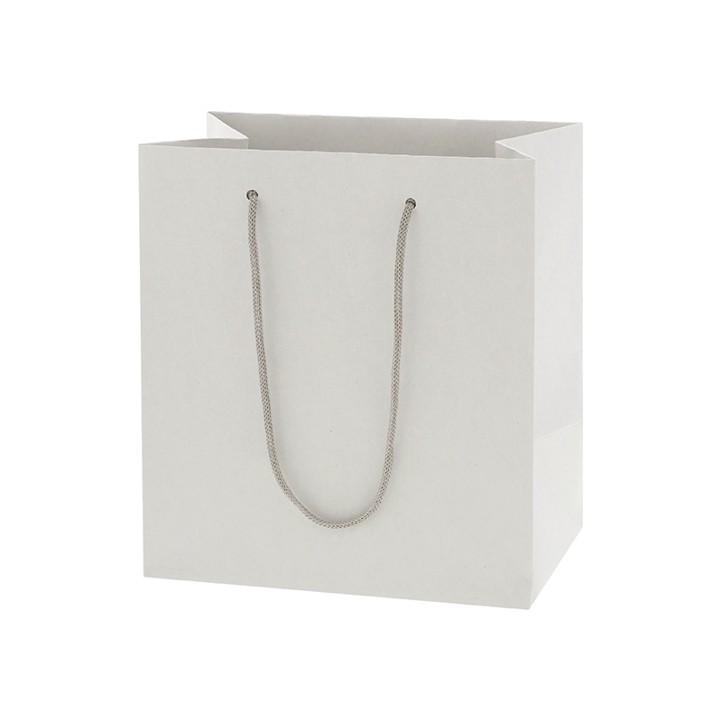 再生紙配合の環境対応紙を使用した紙袋です。少しグレーがかった色合いがスタイリッシュです。持ち手も環境にやさしい紙紐を採用しております。アクリル紐のような柔らかさがあります。ギフト用にもおすすめです。●入数:10枚●手紐:紙紐(グレー)