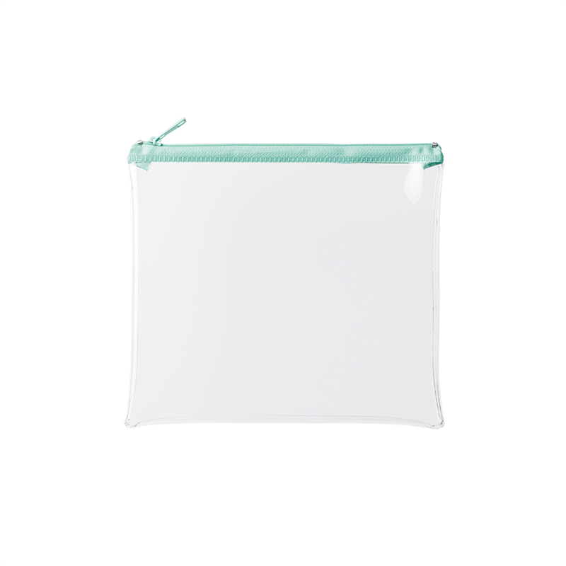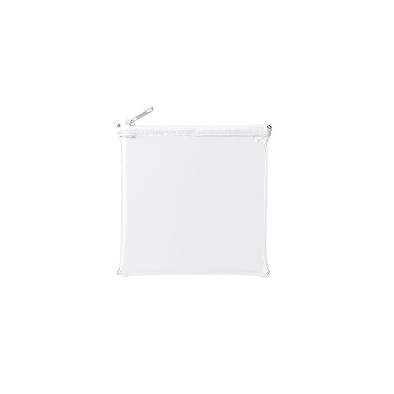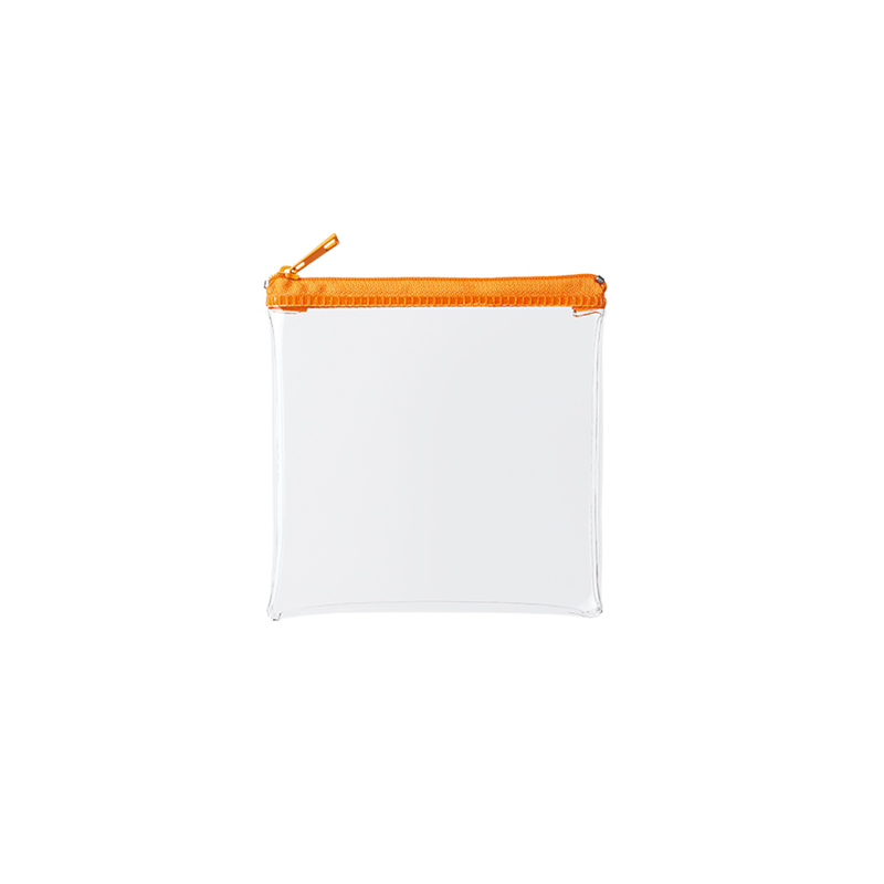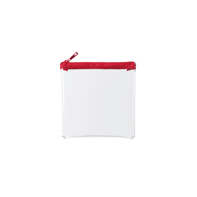 カラーファスナーがポイントの正方形クリアポーチです。ファスナー部分のみカラー展開なので、シンプルな印象でどんなデザインにもマッチするアイテムです。Mサイズはノートやペンなどステーショナリーを入れたセット販売や、水に強いPVC素材のためトラベル用アメニティグッズ入れとしてもおすすめです。単色印刷またはフルカラー印刷に対応しており、キャラクターやスポーツチームロゴ、ブランドロゴなどを名入れし、テーマカラーにファスナーカラーもあわせればオリジナリティの高いアイテムを作成いただけます。