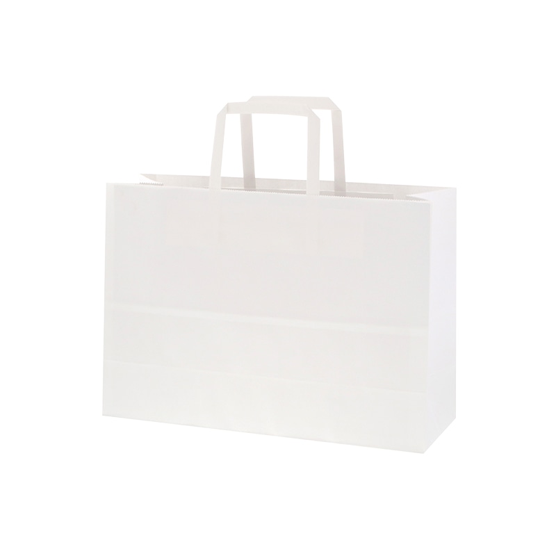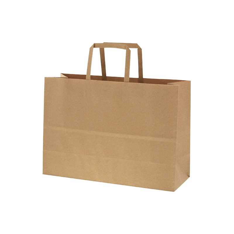 ハンドルは一般的な平紐の幅10mm幅よりも太めの13mm幅を採用しているので、手にやさしく持ちやすい紙袋です。オーソドックスなクラフト無地なので、催事など色々な用途でご使用頂けます。●入数:50枚