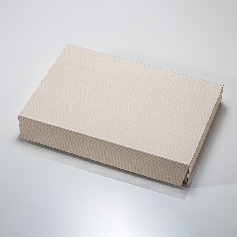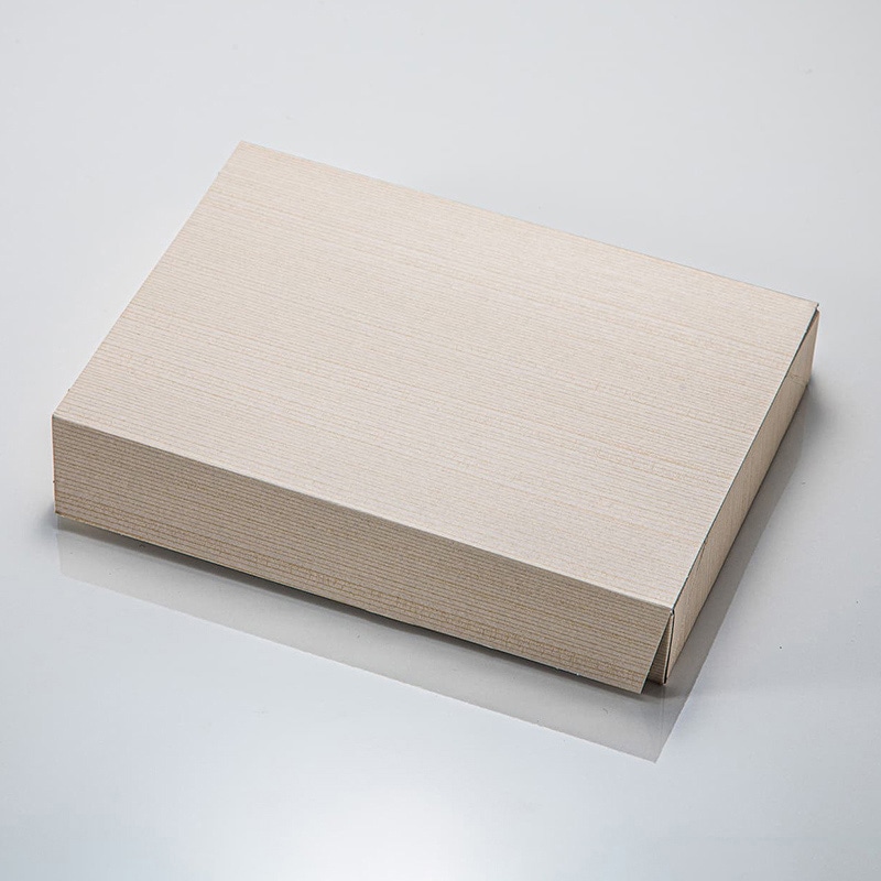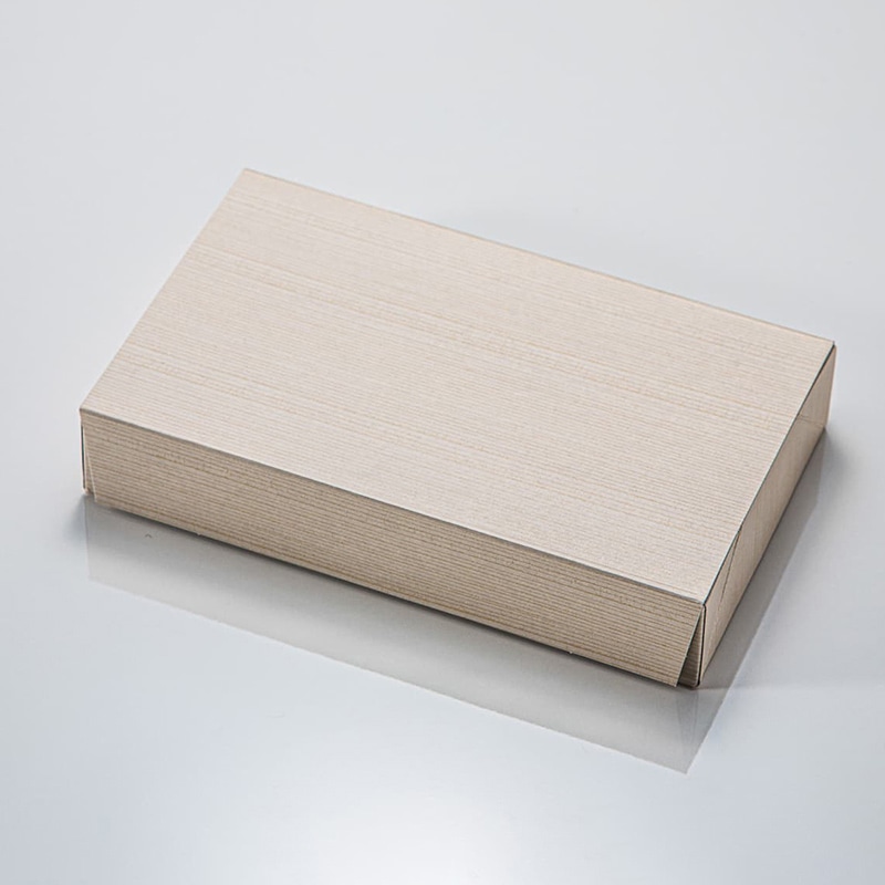柔らかな印象の木目柄を特徴とした、身・フタ式の食品向けパッケージです。内面は銀色で高級感があり、耐水性・耐油性があります。●重量:27.1g/枚●入数:50枚