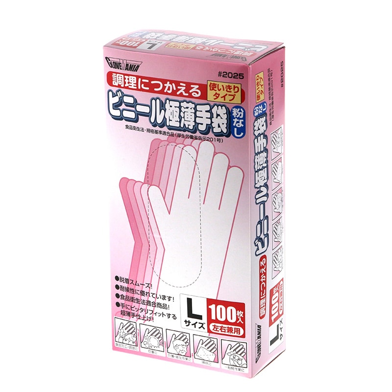 調理に使えるビニール使いきり手袋です。食品衛生法に適合しています。粉なし(パウダーフリー)加工を施し、手にピッタリフィットする超薄手仕上げにより、素手感覚でお使いいただけます。天然ゴム製の手袋に比べて油や洗剤に強く劣化しにくい手袋です。食器洗いなど、水や洗剤での手荒れも防ぎます。左右兼用タイプ。●入数:100枚