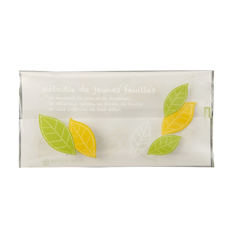 小袋の背面に葉っぱのモチーフを配置し、お菓子がまるで葉っぱに乗っているように見えるユニークで爽やかなデザインです。●脱酸素剤使用可●乾燥剤使用可●入数:500枚