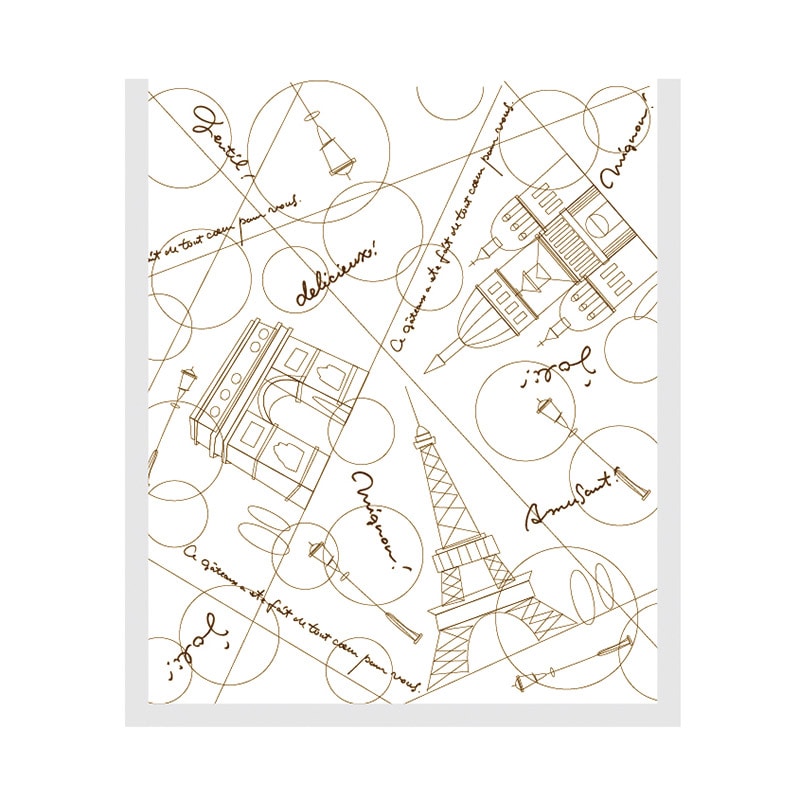 お菓子の焼き色がソフトに見える半透明袋です。エッフェル塔や凱旋門などフランスの風景柄。脱酸素剤使用可。●入数:1000枚