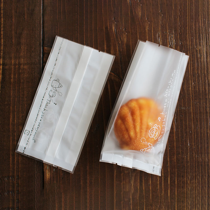 脱酸素剤対応のガゼット型ガスパックです。マットフィルムを使用し、かわいいデザインが手作りのお菓子を引き立てます。パウンドケーキ・フィナンシェ・タルト・クッキーなど、ひとくちサイズの焼菓子などに。ホワイトとクリームの2色があります