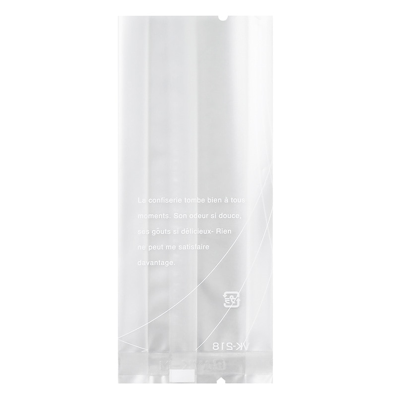 お菓子をやさしく見せる半透明無地のガゼット袋です。シンプルで色々なお菓子に合わせやすいデザイン。開封用のVカット入り。●ヒートシール可●脱酸素剤使用可●乾燥剤使用可●入数:100枚