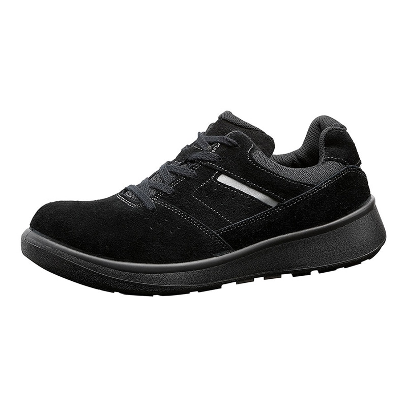 カカト・土踏まず部のホールド力を高めることで先芯をさらにワイドに、快適に。足裏の縦横のアーチをしっかり支えることでフィット感を向上し疲労を軽減します。足裏構造に合わせて設計された立体インソール。カカト中央の一段低く配置されたブロックが接地時に衝撃を分散させます。エグリ形状になったソールが歩行時に形状が変形することで衝撃を吸収しクッション性を向上。つま先とサイドの靴底を斜めにカットすることで引っ掛かりをなくしつまずき防止に役立ちます。耐滑レベル区分5の最高の耐滑性能を誇り、耐久性にも優れる新型ソール。水や油の付着した床面でも全方向にグリップ力を発揮します。カカト部分に縦2本のリフレクターを標準装備し、夜間作業の視認性を高めます。●JIS S種●製法:I式●先芯:新ワイド樹脂●中敷:プレミアムインソール(抗菌・防臭)●靴底:発泡ポリウレタン2層底