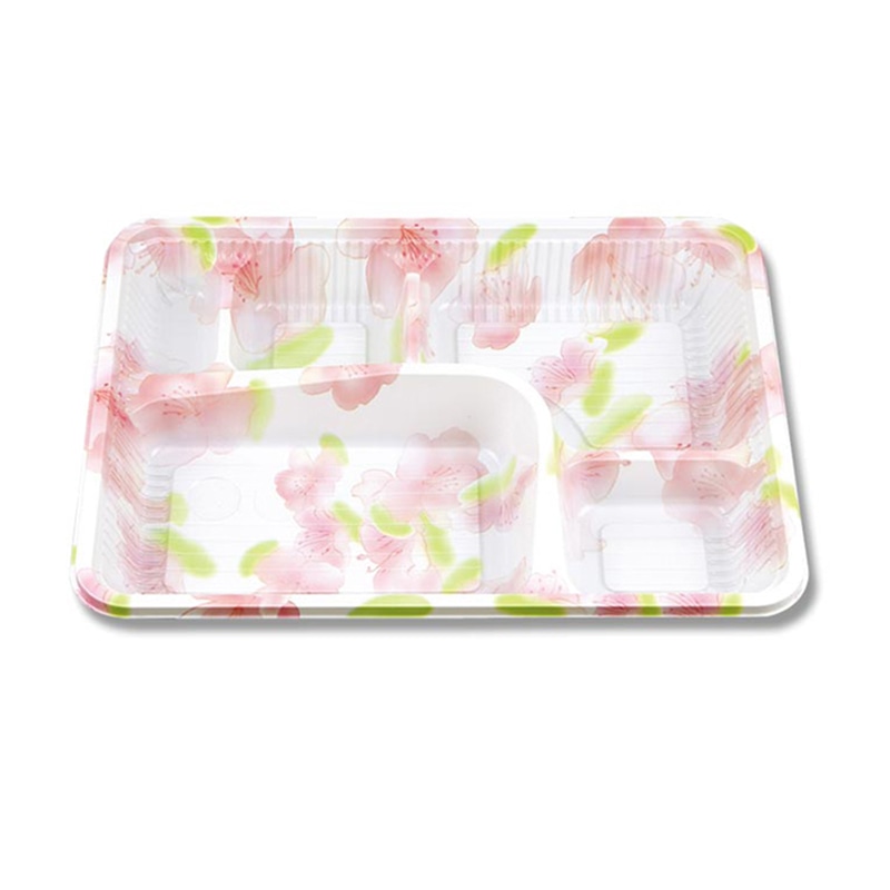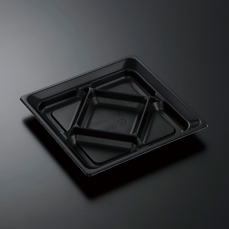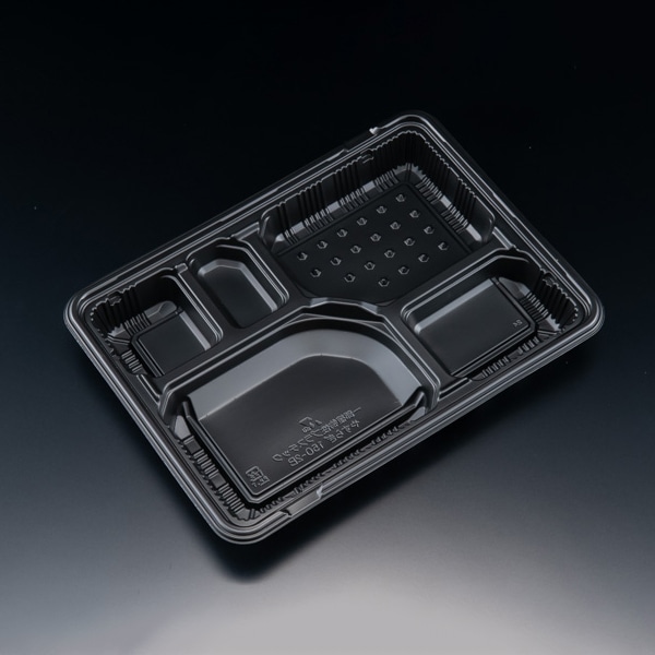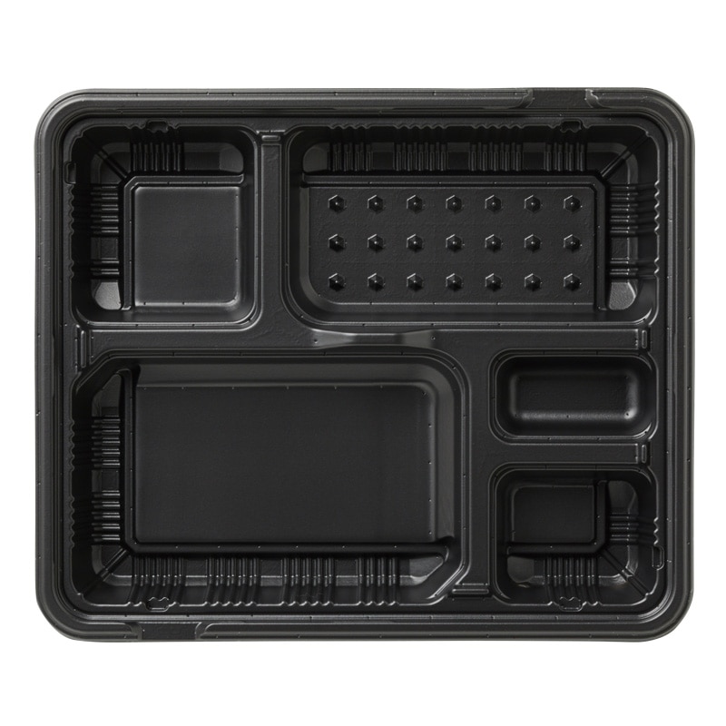 テイクアウト専用の本体・蓋一体型の容器です。植物素材を一部配合した環境対応商品です。●仕切りの数:5●電子レンジ使用可●オーブン使用不可●耐油性あり●耐熱温度:130℃●ご飯容量:150g●入数:25枚