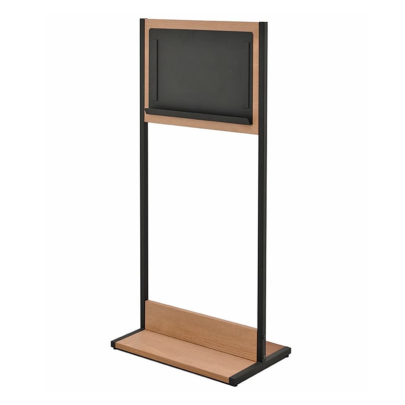 A4縦サイズの掲示に適した縦型の案内板。掲示面はスチール製で付属のマグネットバー2本を使った掲示が可能です。掲示面が傾斜した従来の案内板とは異なり、離れた位置からでも目につきやすい直立タイプ。掲示面下は受けになっており、厚み10mm程度のメニューや冊子を置くこともできます。ウッドとブラックの組み合わせでカジュアルながらも洗練されたデザイン。店頭やオフィスのエントランス等で上質な接客スペースを演出します。●組立時間:2人以上で約20分(要プラスドライバー)●脚部・掲示板材質:スチール(粉体塗装)●マグネットバー材質:スチール(粉体塗装)・マグネット