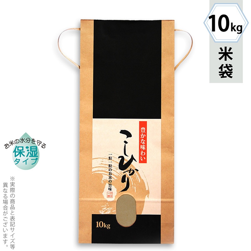 直売所や産直での利用に便利な、紐付クラフト米袋です。「こしひかり」を入れるのにぴったりな米袋です。内側をコーティングし、乾燥しにくい保湿タイプ。紐を結んで封をするタイプで、包装機械不要。窓付き。