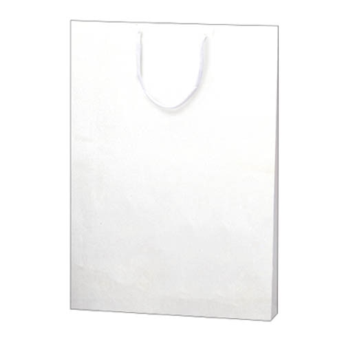 樹脂製の接着剤で手紐を取り付けた手提げ紙袋です。紐の結び目がなくすっきりし、物の出し入れがスムースで、ストックする際にかさばらないメリットがあります。A4縦対応の定番中型サイズ。汎用性の高い白無地。●手紐:PP紐白●入数:25枚