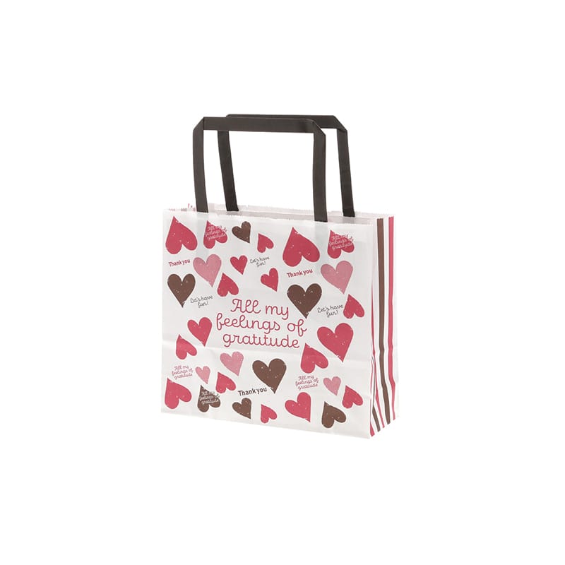 柔らかな色合いのハートが降り注ぐデザインの手提げ袋です。可愛すぎないモチーフが年齢を問わずお使いいただけます。お菓子の詰め合わせにぴったりな小型サイズ。裏面は英文表記がありません。紐は外に出た状態で包装してあります。●手紐:平紐茶●入数:50枚