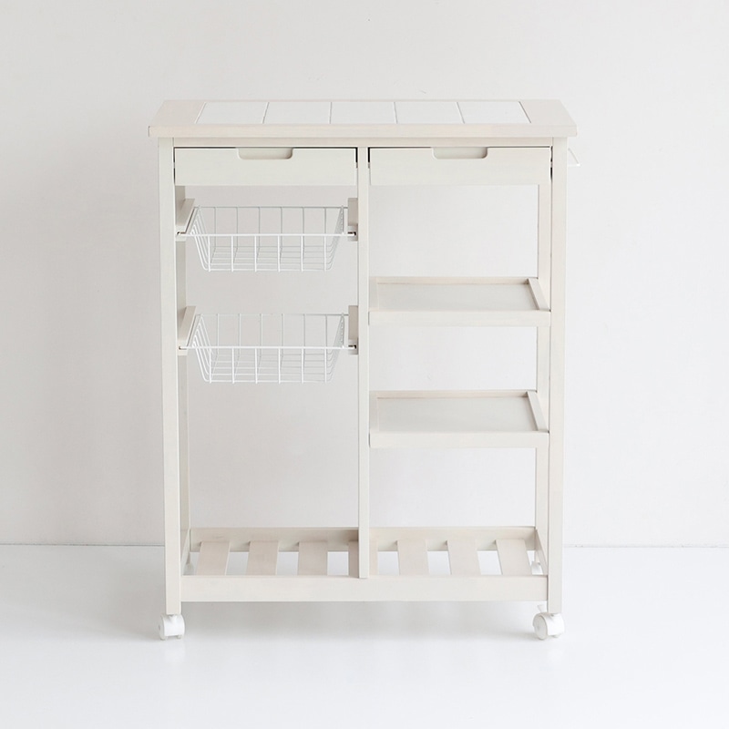 天然木とホワイトタイルの組み合わせが美しい、大容量のキッチンワゴンです。作業台やサブテーブルとして、いろんなシーンで大活躍します。タイルは熱に強いので一時的に鍋などの調理器具を置くことができます。天板はトースターと小物類をいくつか置けるくらいのスペースがあります。コーヒーメーカーやケトルなどを置くのにもぴったりサイズです。引き出しが2つ付いているので、カトラリーやラップなどバラバラする物を収納できます。2枚の棚板は4段階で高さを変えられます。収納物に応じて高さを調整してスペースを有効活用できます。引き出せるカゴは、レトルトや缶詰などを入れるのに便利です。2段あるので、たっぷり収納できます。バーが付いているのでタオルや布巾の置き場に困りません。フックを掛ければ引っ掛けて収納することも可能です。※木製品のため商品の色味・木目が若干異なることがあります。●組立品●重量:約12kg●耐荷重:天板8kg/バスケット2kg/木製引出4kg/棚板2kg/フック0.5kg/底板8kg●タイル部分耐熱温度:180℃●組立時間:約30分