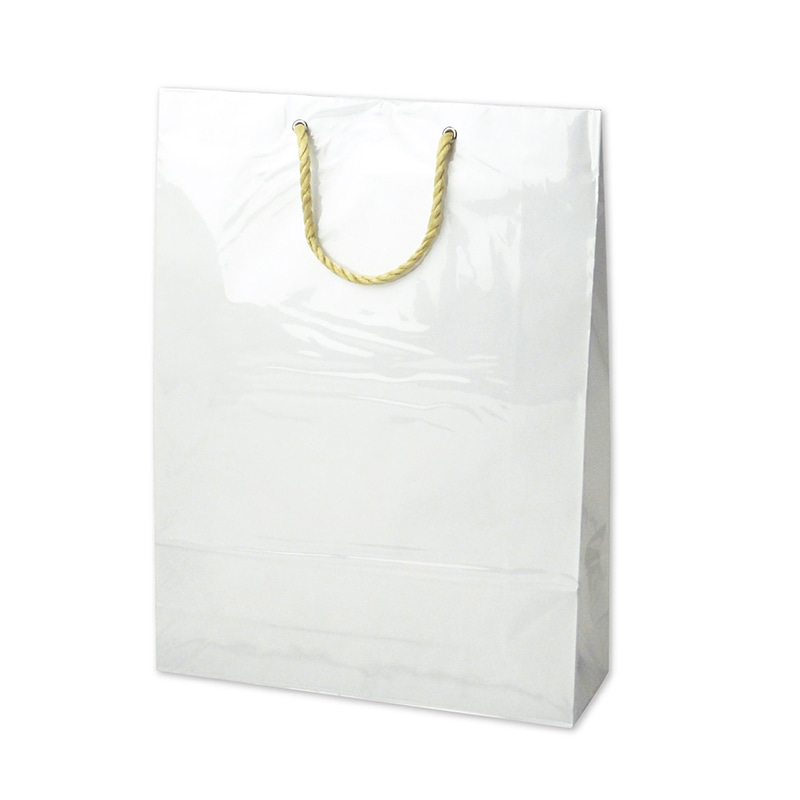 ビニールカバー付だから急な雨でも安心です。白無地のシンプルなビニールカバー付手提げ袋です。持ち手はしっかりとしたPP製丸紐を使用。ジャケットなどの洋服を入れるのにちょうどいいサイズです。●ビニールかぶせ●底ボール付