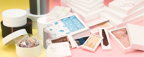 スタンダードな無地ボックスや、透明フィルム付きの窓のついた窓付き箱、たまごパックのような形状のパルモパックなどバリエーション豊富!