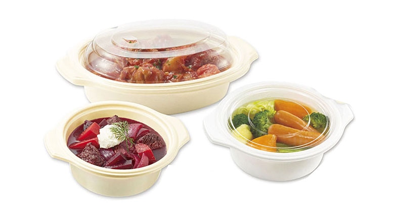 中皿を使用することで、ごはんと具材、スープと麺などを分けて盛れる丼容器です。2層構造で美味しさを保持。断熱性が高く冷めにくいため、中身はアツアツでも熱くない材質を採用しています。
