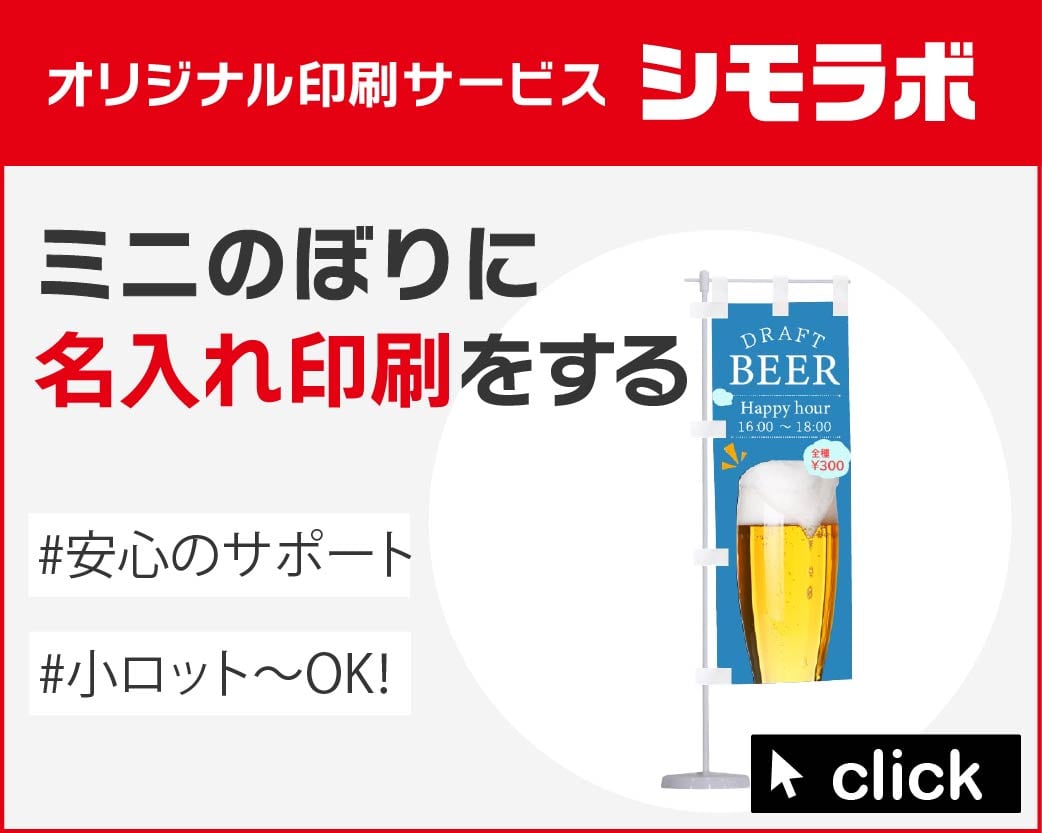 「オリジナル印刷サイト シモラボ」では、のぼり・のれんなどの店舗用品はもちろん、紙袋・ポリ袋・ノベルティなど、お店づくりに欠かせないアイテムを小ロットからオーダー可能。ブランドや店舗の雰囲気にぴったりなデザインで、世界にひとつだけのアイテムが作れます。