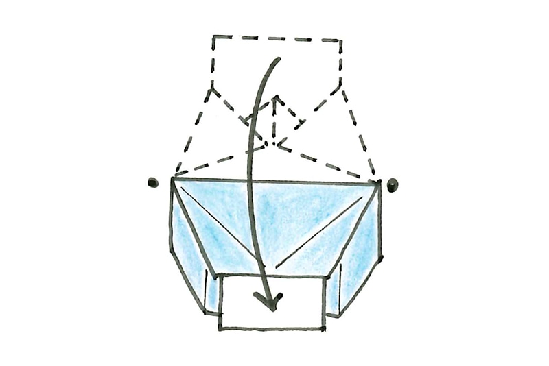 3の形にもどし、5の正方形の下半分を袋の中へ入れます。
