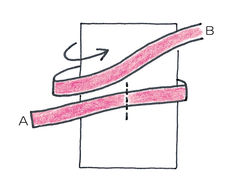 リボンAが上向き、リボンBが下向きになるように中心で交差させます。