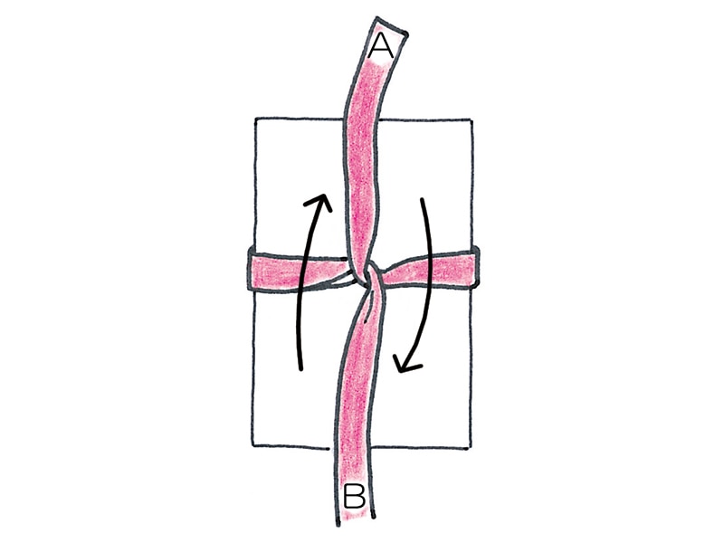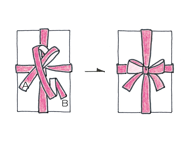全体をひきしめた状態からリボンAで輪を作り、リボンBをまわしかけて蝶結びをします。蝶結びの前に固結びは行いません。