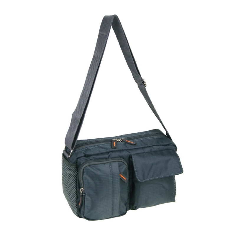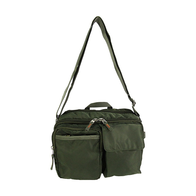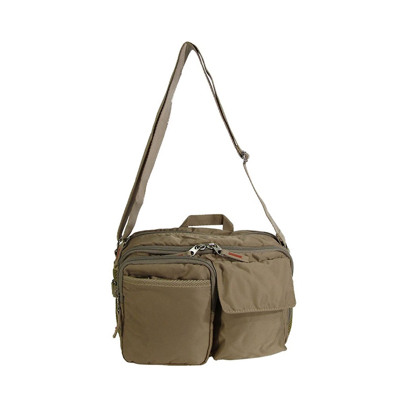 正面にラウンドファスナー立体ポケットとフラップ立体ポケットがついたショルダーバッグです。ラウンドファスナー立体ポケットには、縦に開閉するファスナーポケットもさらに付いています。両サイドにもメッシュポケットが付いているので仕分けに便利です。