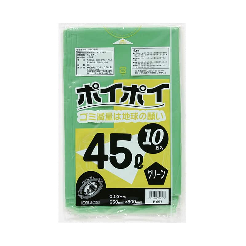 プラテック45 ゴミ袋 ポイポイ グリーン 0.03mm 45L 10枚入 P-657 1束(ご注文単位50束)【直送品】