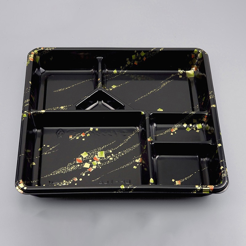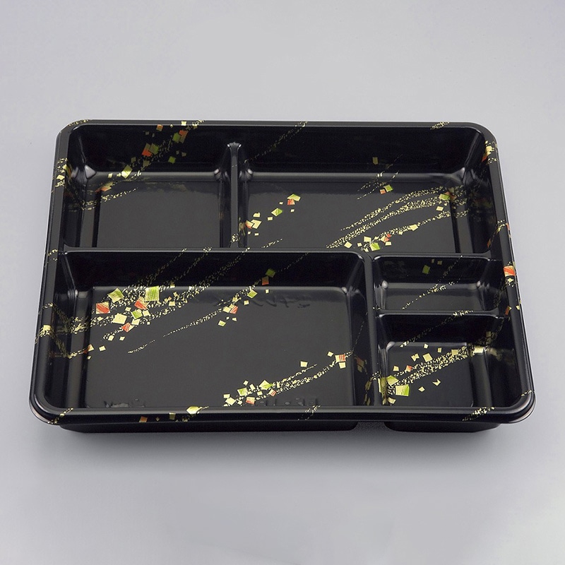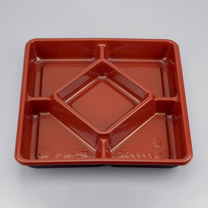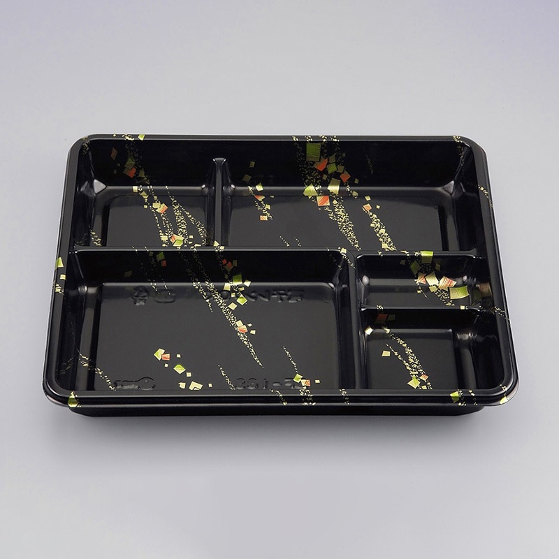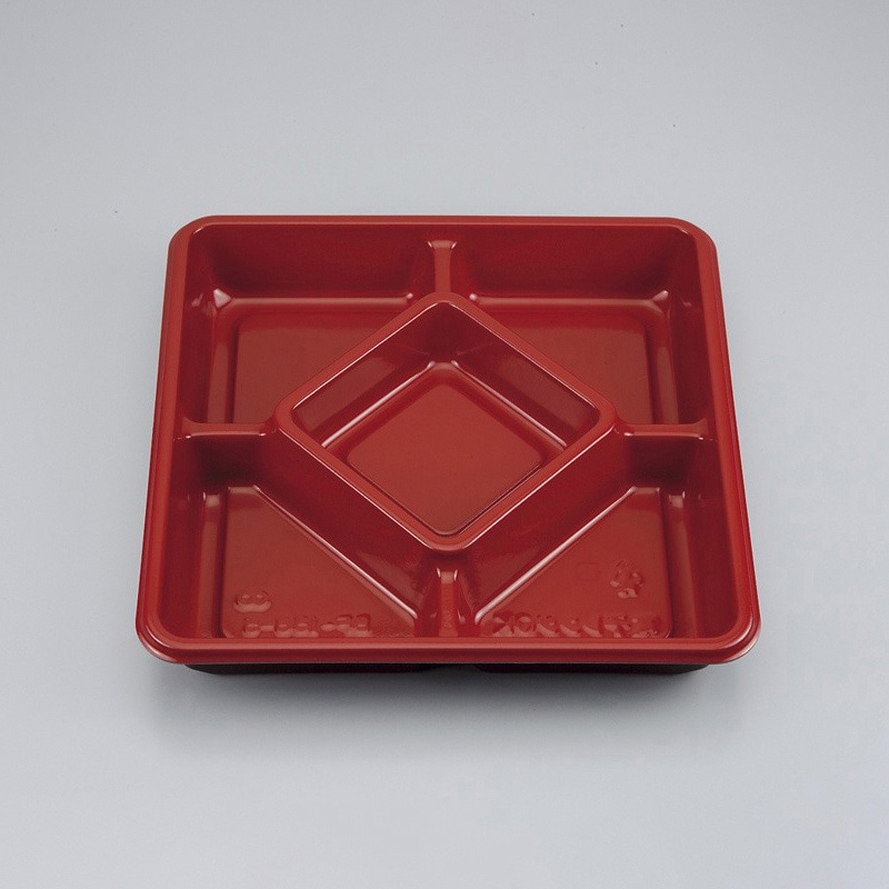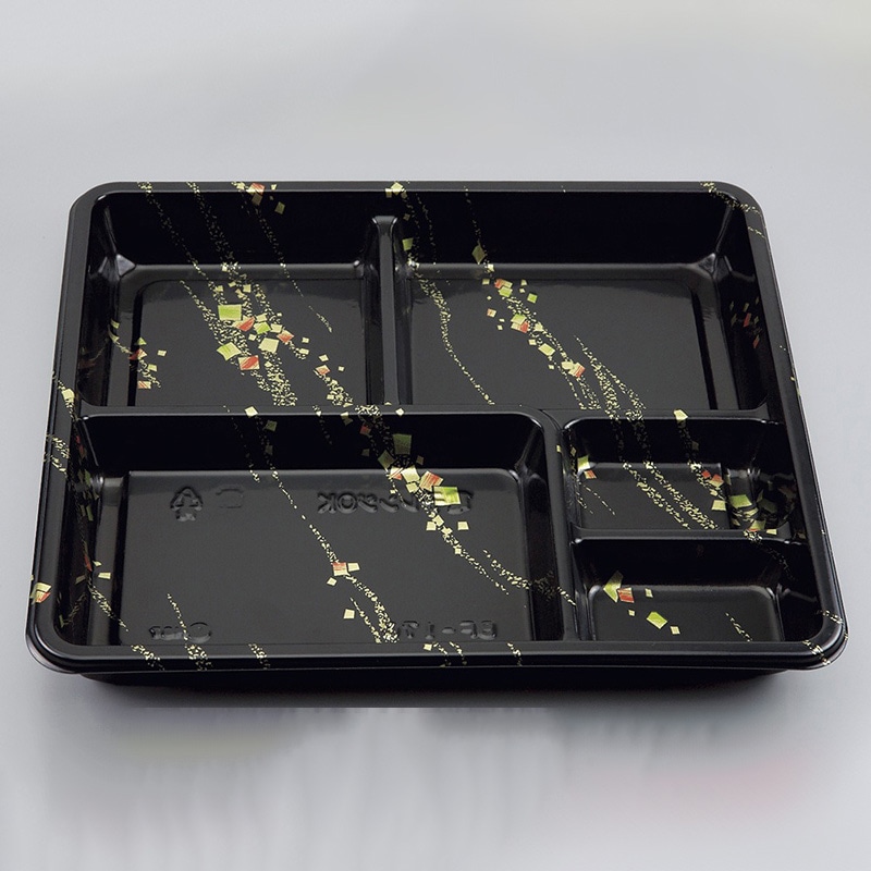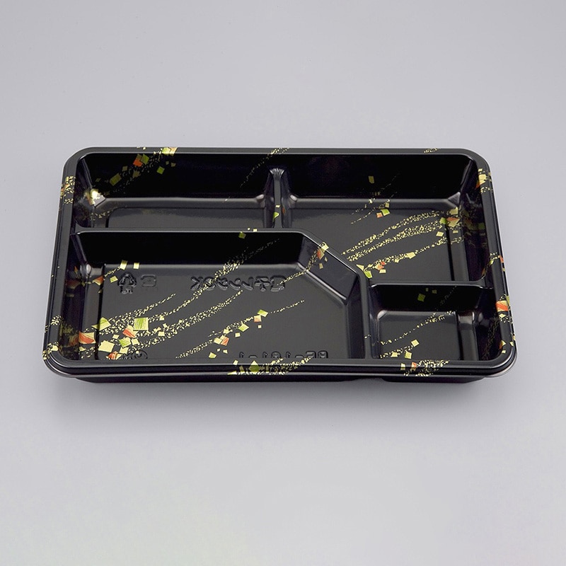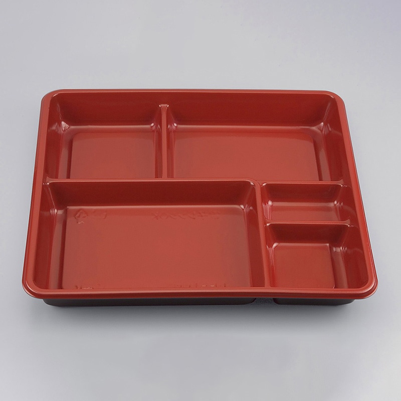 低発泡ポリスチレン製の弁当容器です。5仕切り。外嵌合蓋「BF-166嵌合蓋」は別売です。●電子レンジ使用可●耐熱温度:105℃●ごはんの量:約280g●入数:50枚