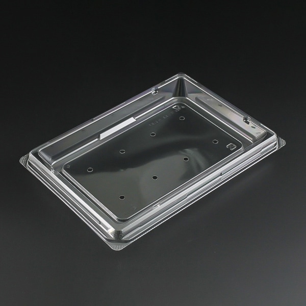 ミニトマト200g用の本体・蓋一体型の容器です。ヒンジがなくシャープな形状です。天面に青果のガス抜き穴が4ヶ所空いています。●電子レンジ使用不可●耐油性:あり●耐熱温度:60℃●入数:50枚
