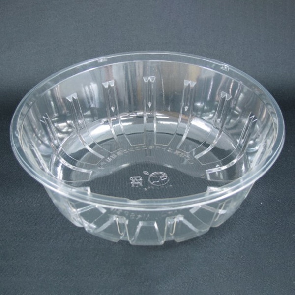 本体天面の突起で隙間をつくり通気性を確保、食材が傷みにくい青果容器です。本体・蓋一体型、丸形タイプ。嵌合部の通気口を3ヶ所設定。蓋は外嵌合蓋です。バイオ素材を使用。●電子レンジ使用不可●耐熱温度:60℃●耐油性:あり●入数:50枚