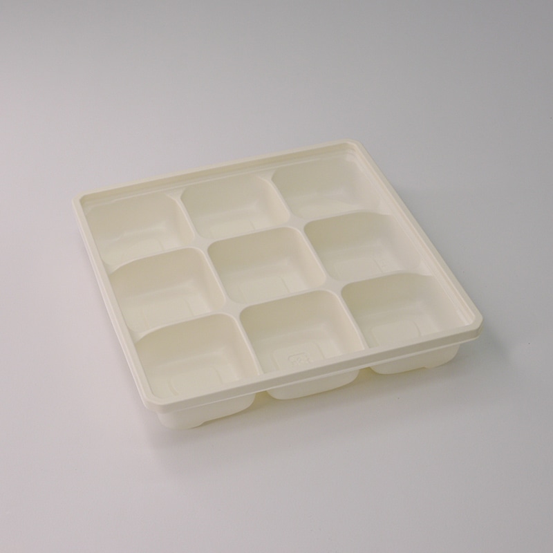 ワンタッチで組み立てられる3パーツ構造の折箱の「底(ソコ)」です。「55(30)縁(フチ)」「55K高蓋(フタ)」をパーツ別にオーダーできるので、機能・カラー・デザインなどを簡単に組み合わせできます。また、完成品に比べ、ストックスペースが約半分になります。惣菜弁当、松花堂弁当におすすめです。9仕切りタイプ。●電子レンジ使用可●耐熱温度:95℃●耐油性:なし●ごはんの量:約20g●入数:50枚
