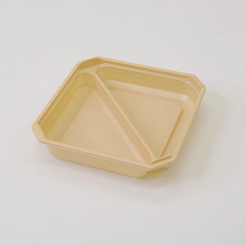 ワンタッチで組み立てられる3パーツ構造の折箱の「底(ソコ)」です。「縁(フチ)」「蓋(フタ)」をパーツ別にオーダーできるので、機能・カラー・デザインなどを簡単に組み合わせできます。また、完成品に比べ、ストックスペースが約半分になります。下段はフタなしで重ねられ、二段重にすることができます。2仕切りタイプ。●電子レンジ使用可●耐油性:なし●耐熱温度:95℃●ごはんの量:約100g●入数:50枚