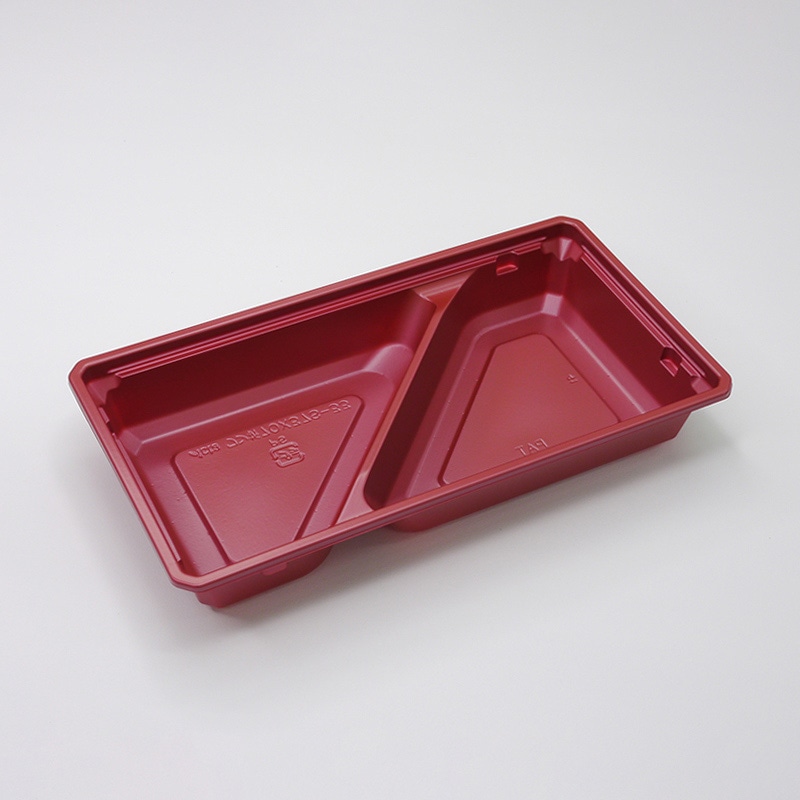 ワンタッチで組み立てられる3パーツ構造の折箱の「底(ソコ)」です。「縁(フチ)」「蓋(フタ)」をパーツ別にオーダーできるので、機能・カラー・デザインなどを簡単に組み合わせできます。また、完成品に比べ、ストックスペースが約半分になります。使いやすい定番サイズの弁当。2仕切りタイプ。●電子レンジ使用可●耐油性:なし●耐熱温度:95℃●ごはんの量:約120g●入数:50枚
