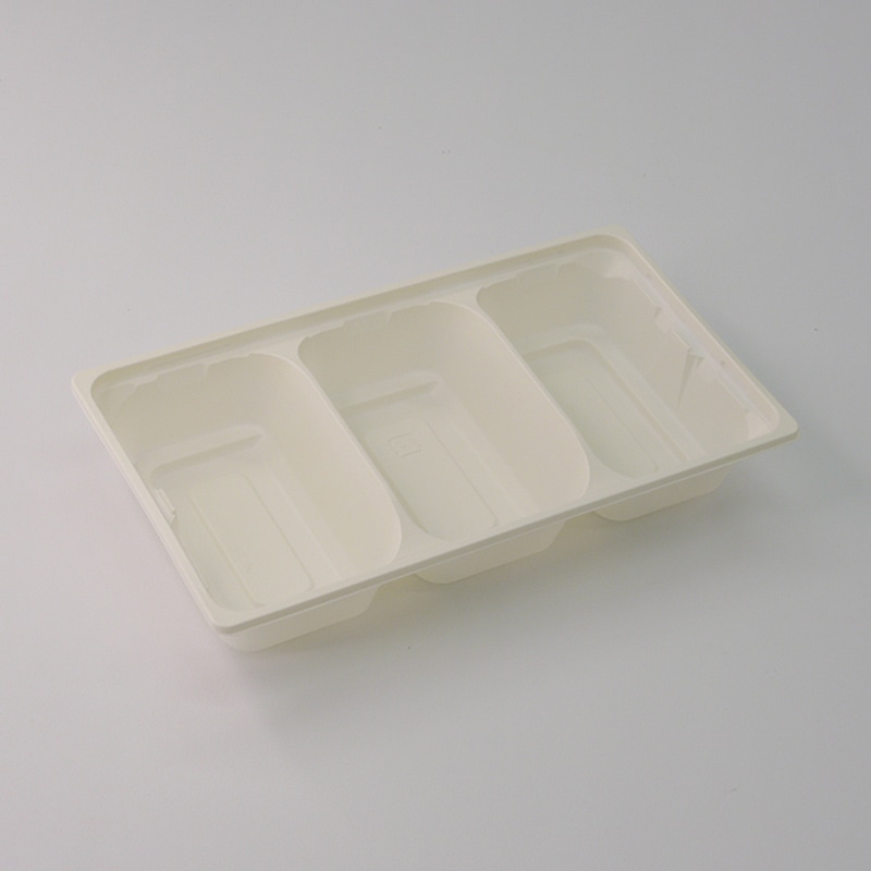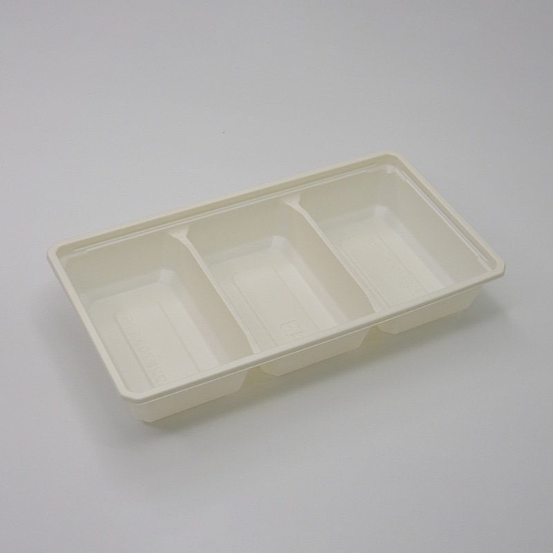 ワンタッチで組み立てられる3パーツ構造の折箱の「底(ソコ)」です。「縁(フチ)」「蓋(フタ)」をパーツ別にオーダーできるので、機能・カラー・デザインなどを簡単に組み合わせできます。また、完成品に比べ、ストックスペースが約半分になります。使いやすい定番サイズの弁当。3仕切りタイプ。●電子レンジ使用可●耐油性:なし●耐熱温度:95℃●ごはんの量:約85g●入数:50枚