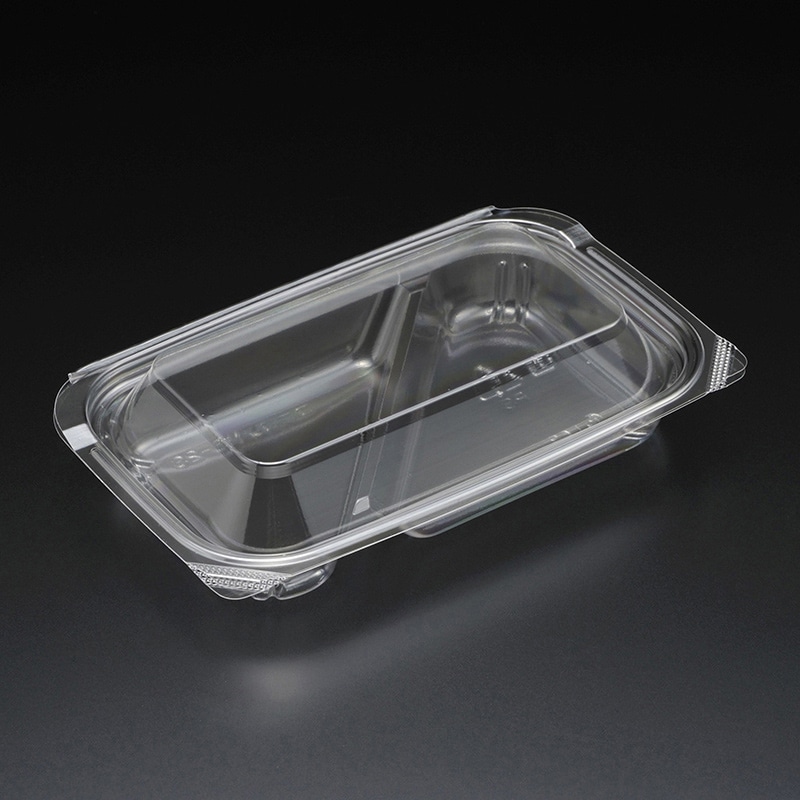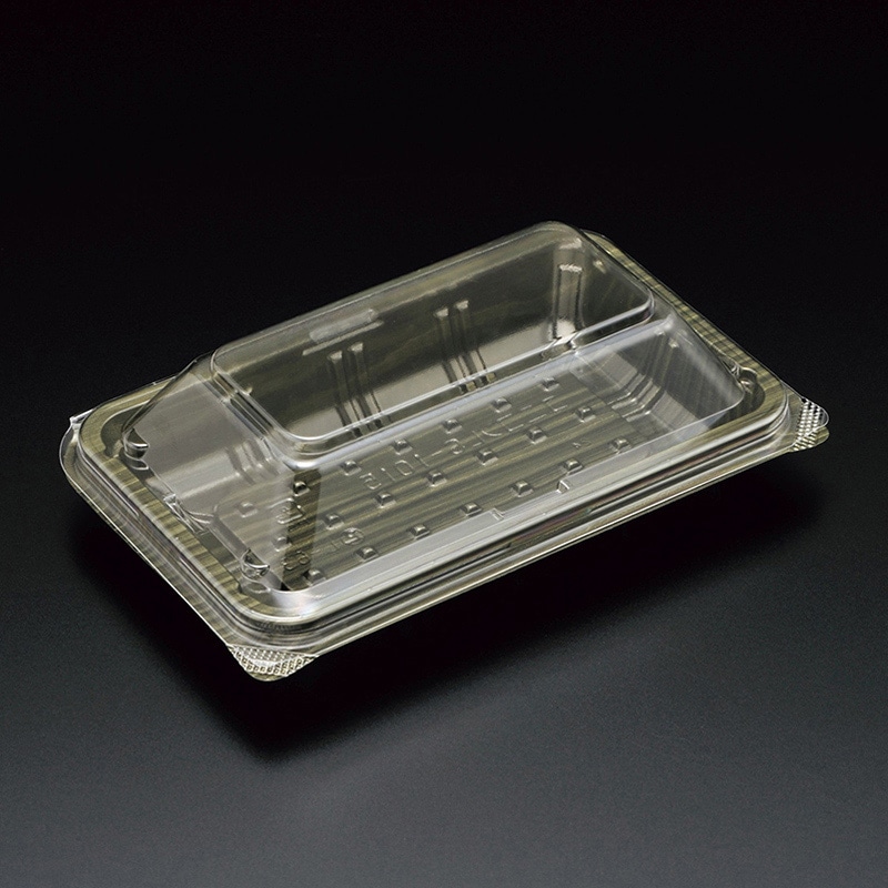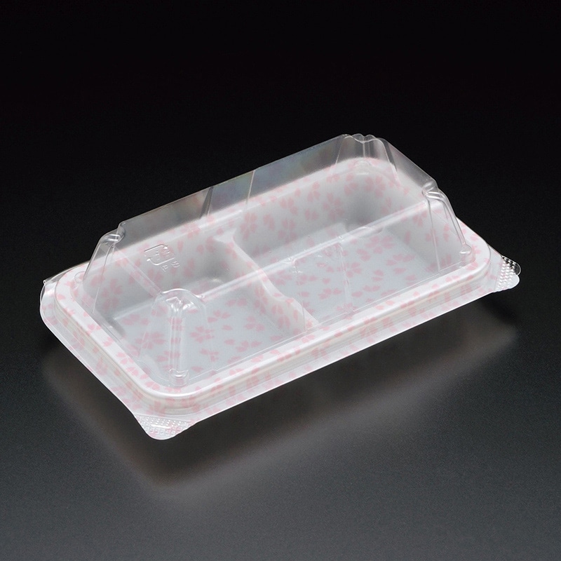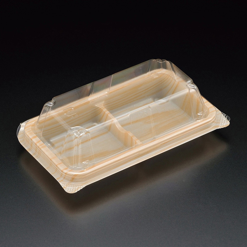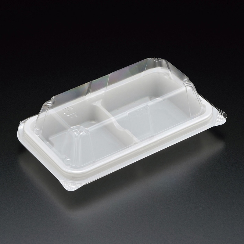 本体・蓋一体型の嵌合容器です。2仕切り。和菓子×2個向け。ロースタックタイプ。●電子レンジ使用不可●オーブン使用不可●耐熱温度:90℃●入数:100枚