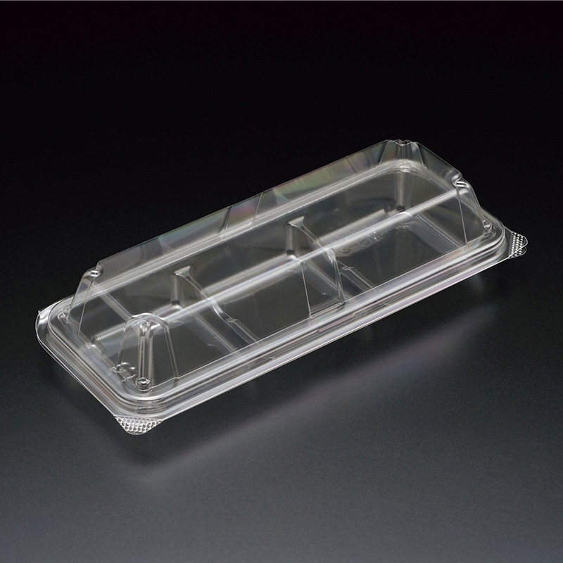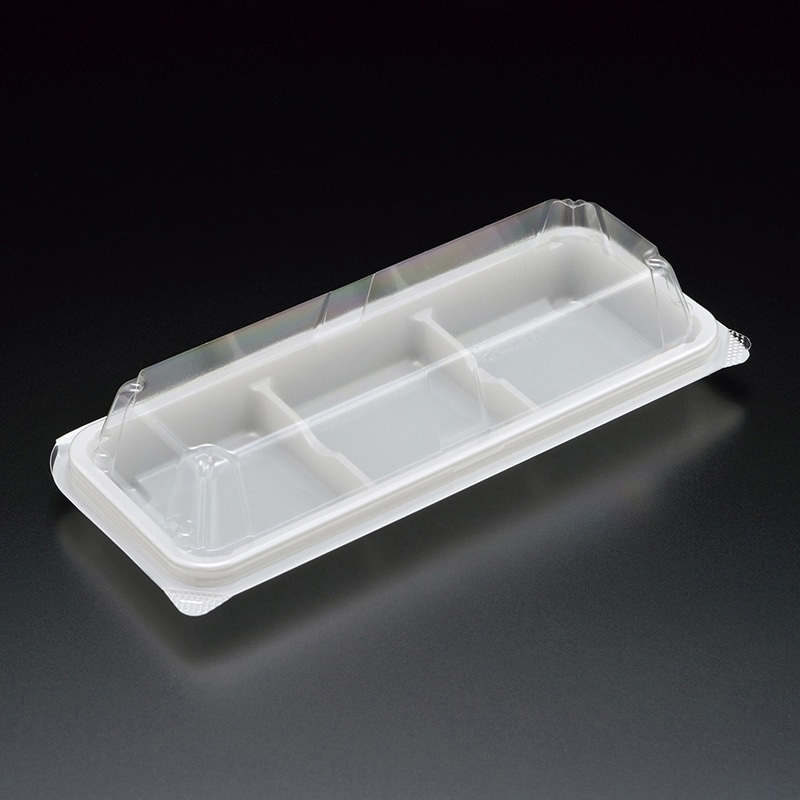 本体・蓋一体型の嵌合容器です。3仕切り。和菓子×3個向け。ロースタックタイプ。●電子レンジ使用不可●オーブン使用不可●耐熱温度:90℃●入数:100枚