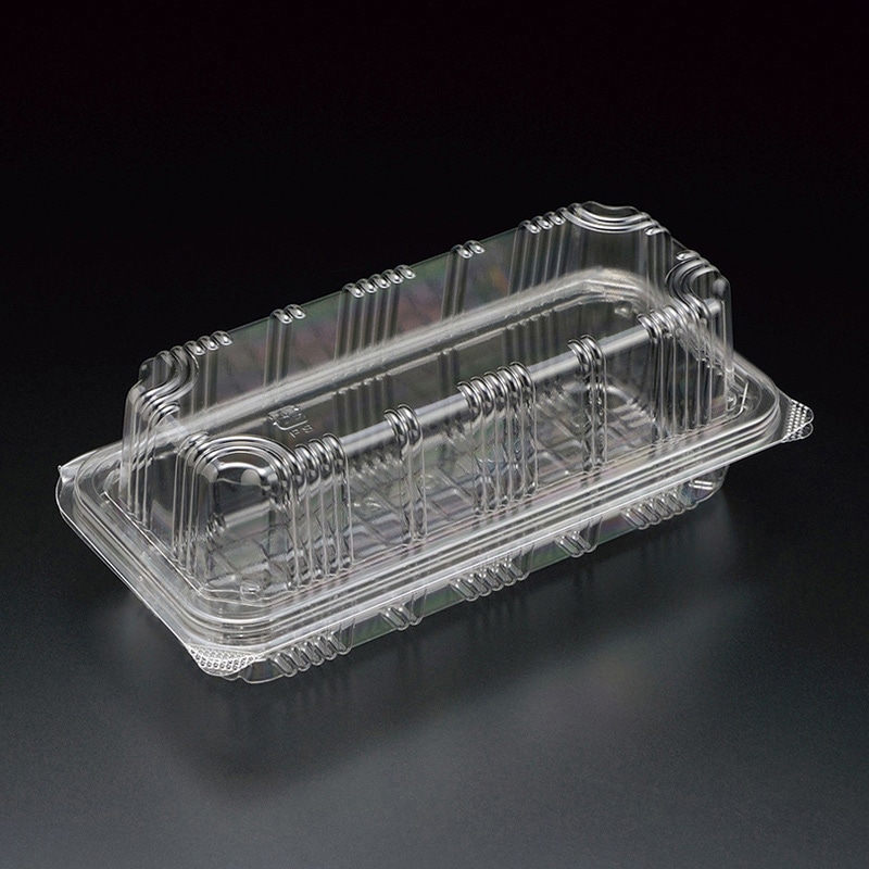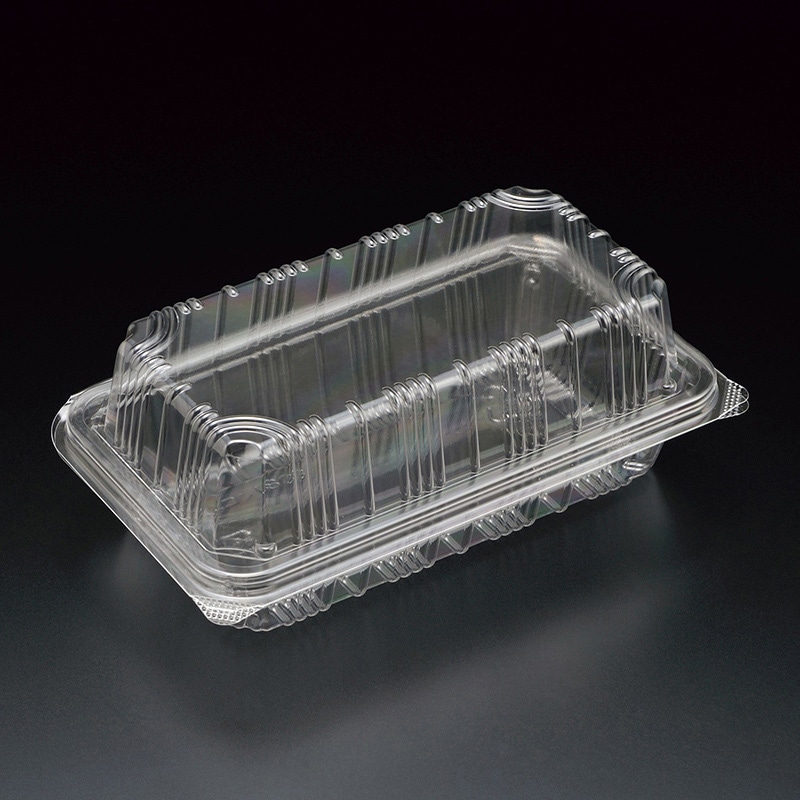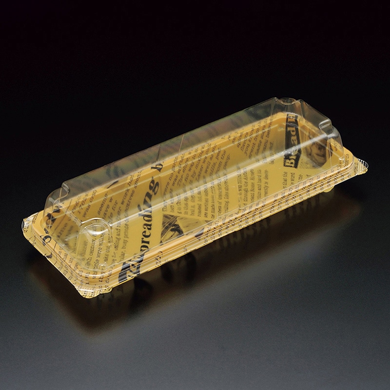 本体・蓋一体型の嵌合容器です。サンドイッチ耳付き食パン1/2カットのサイズ感。また、ホットドック、ロールケーキ等に。ロースタックタイプ。●電子レンジ使用不可●オーブン使用不可●耐熱温度:90℃●容量:350cc●入数:100枚