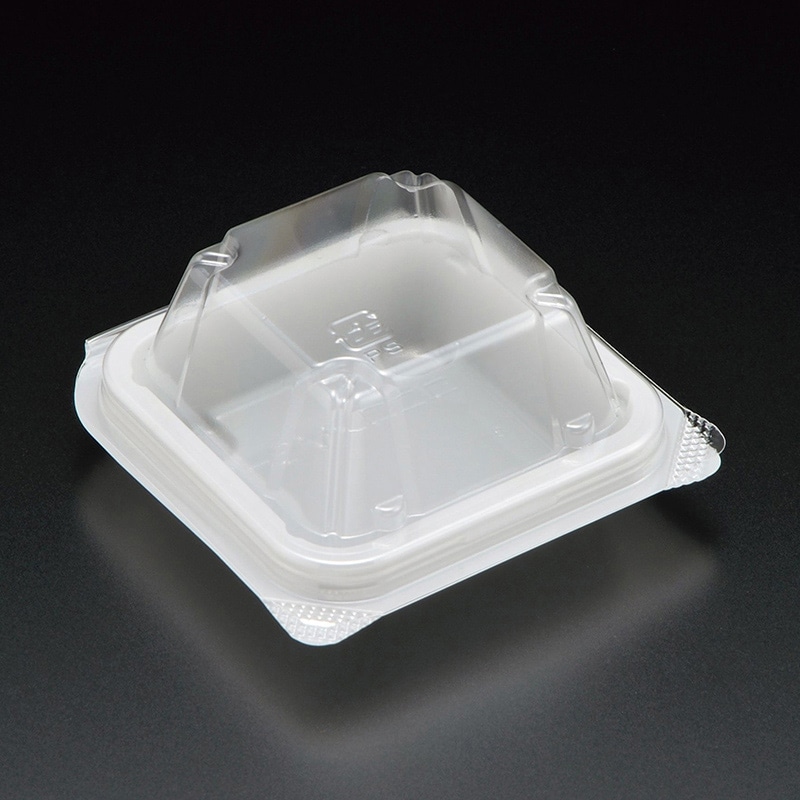 本体・蓋一体型の嵌合容器です。100gおにぎり×2個を想定したサイズ感。盛蓋形状で小ぶりなフルーツデニッシュ等にも。●電子レンジ使用不可●オーブン使用不可●耐熱温度:90℃●入数:100枚