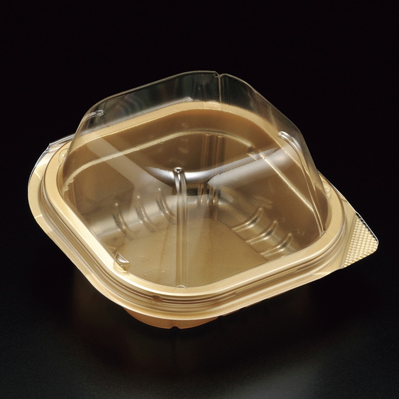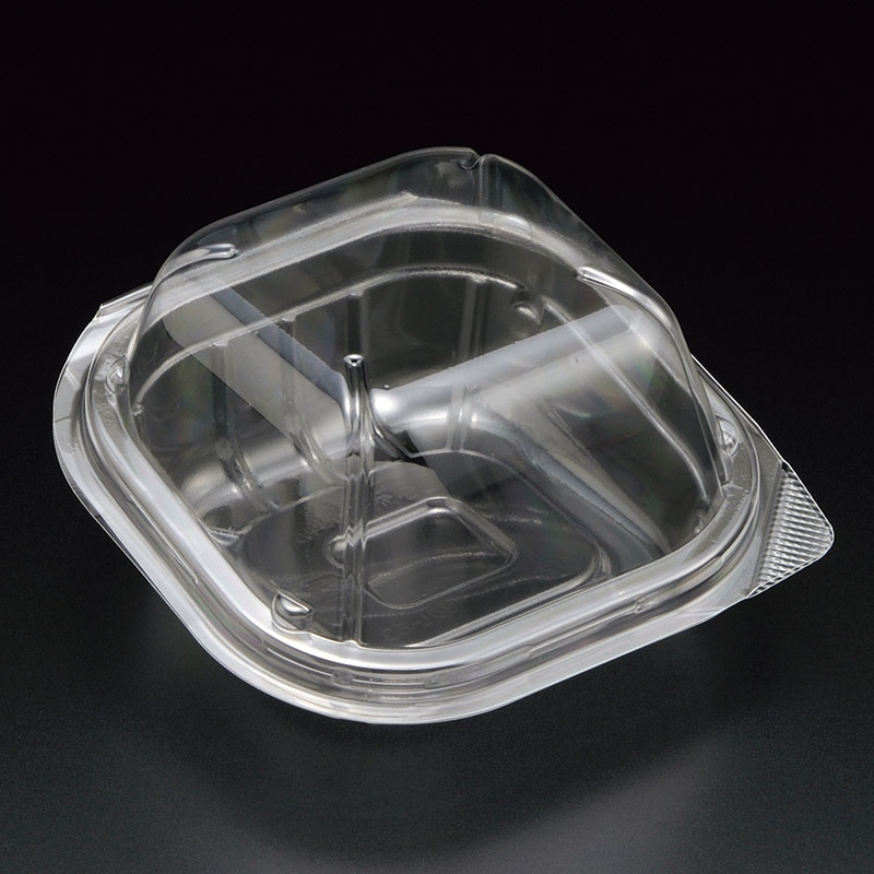 本体・蓋一体型の嵌合容器です。4仕切り。和菓子×4個向け。ロースタックタイプ。●電子レンジ使用不可●オーブン使用不可●耐熱温度:90℃●入数:100枚