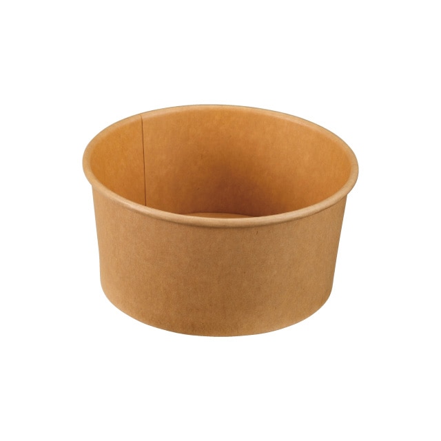クラフト紙のフードカップ。耐油、耐水対応。惣菜、弁当、スープと多岐にわたってご使用頂けます。レンジ対応不可。容量約750cc。※蓋は別売り。開閉時の汁漏れにご注意下さい。未晒しタイプ。●入数:25枚