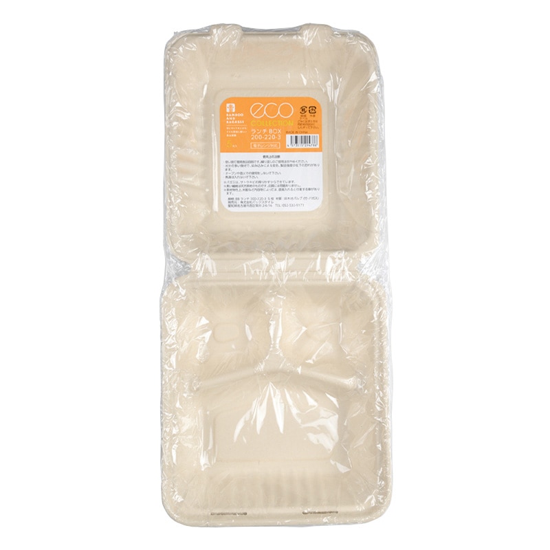 竹とバガス(サトウキビの搾りかす)の混合素材からできた、植物由来の業務用・使い捨てテイクアウトランチボックス。サイズや仕切りの違いで13種類展開。お惣菜など軽食からパスタなどしっかりめのランチまで幅広く活用できます。耐油耐水性、電子レンジにも対応しています。3仕切り。※内側にコーティング加工がされていない為、米飯など粘り気のある内容物を直接入れると、材質の特性により食品に素材が付着する場合がございます。用途に応じて、クッキングペーパーやワックスペーパーを併用頂くと安心してご使用いただけます。●電子レンジ使用可●ごはんの量:約200g/60g×2●入数:50枚