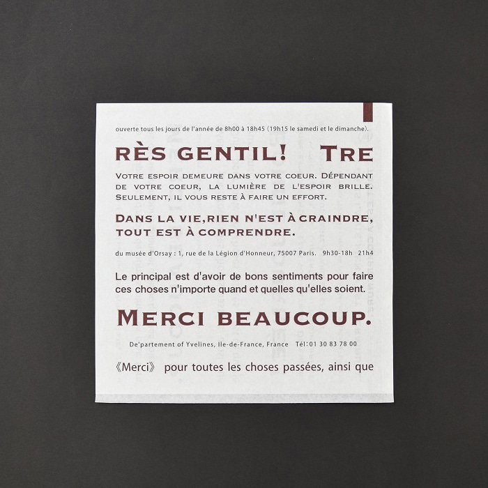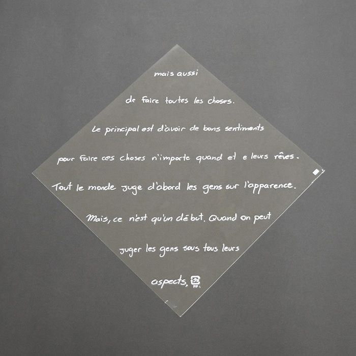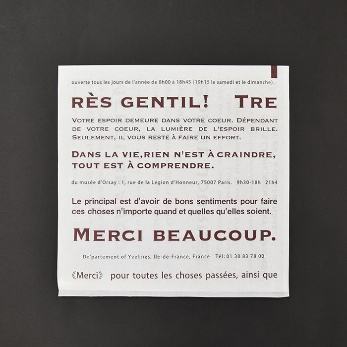 フランス語のデザインをあしらったOPP製のバーガー袋です。表裏のデザインが異なり、片面は文字量を多くし、反対側はシンプルに「MERCI BEAUCOUP.」の一文となっています。●入数:100枚